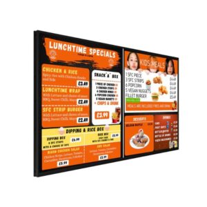 Màn hình Menu Board 65 inch là một loại màn hình quảng cáo phổ biến được sử dụng để hiển thị menu, giới thiệu sản phẩm và dịch vụ của các doanh nghiệp F&B. Với tính năng hiển thị ảnh và video chất lượng cao, màn hình Menu Board digital mang đến cho bạn những hình ảnh ấn tượng và hỗ trợ nâng cao hiệu suất quảng cáo của doanh nghiệp.